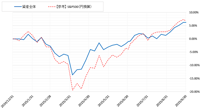 濃い青色が総資産です。赤点線はベンチマークとしている円換算のS&P500です。